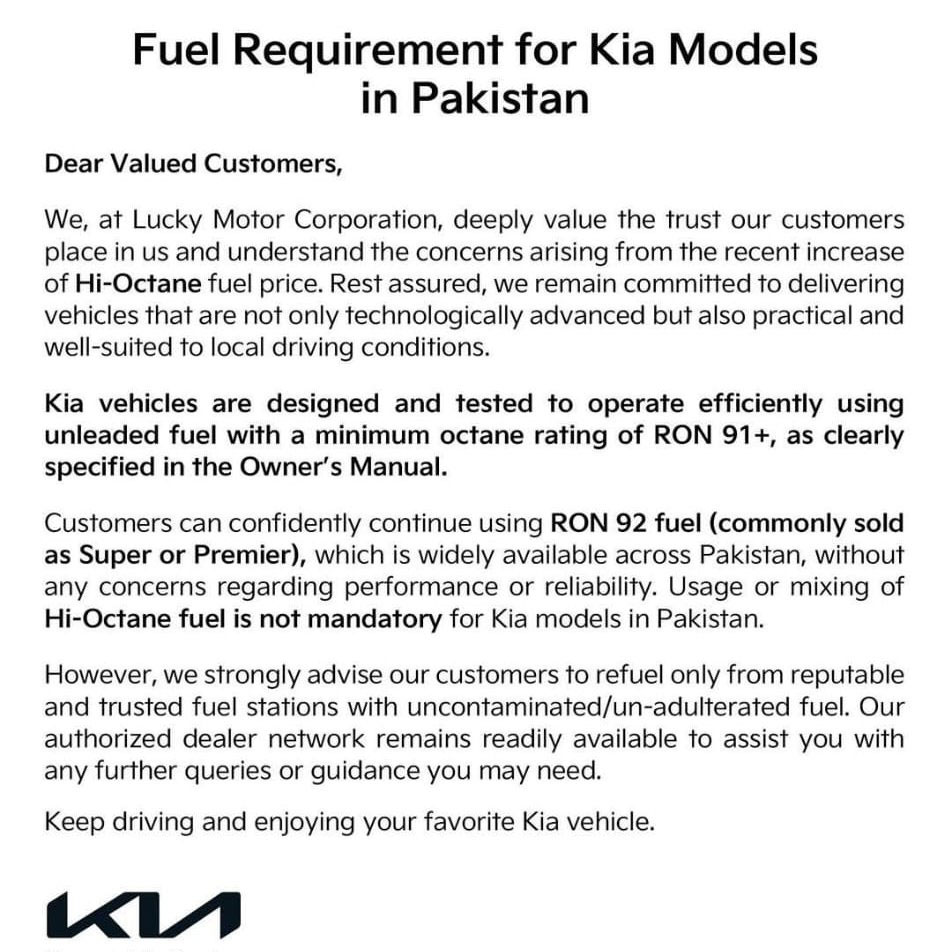Lucky Motor Corporation, the official assembler and distributor of Kia vehicles in Pakistan, has issued a clarification regarding fuel requirements for its vehicles following the recent surge in high-octane fuel prices.